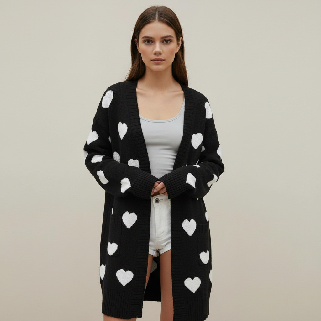 Embrace the cozy charm of our Heart V-Neck Long Cardigan, perfect for a relaxed yet stylish look. This mid-length cardigan features a delightful heart pattern, adding a touch of whimsy to your wardrobe.